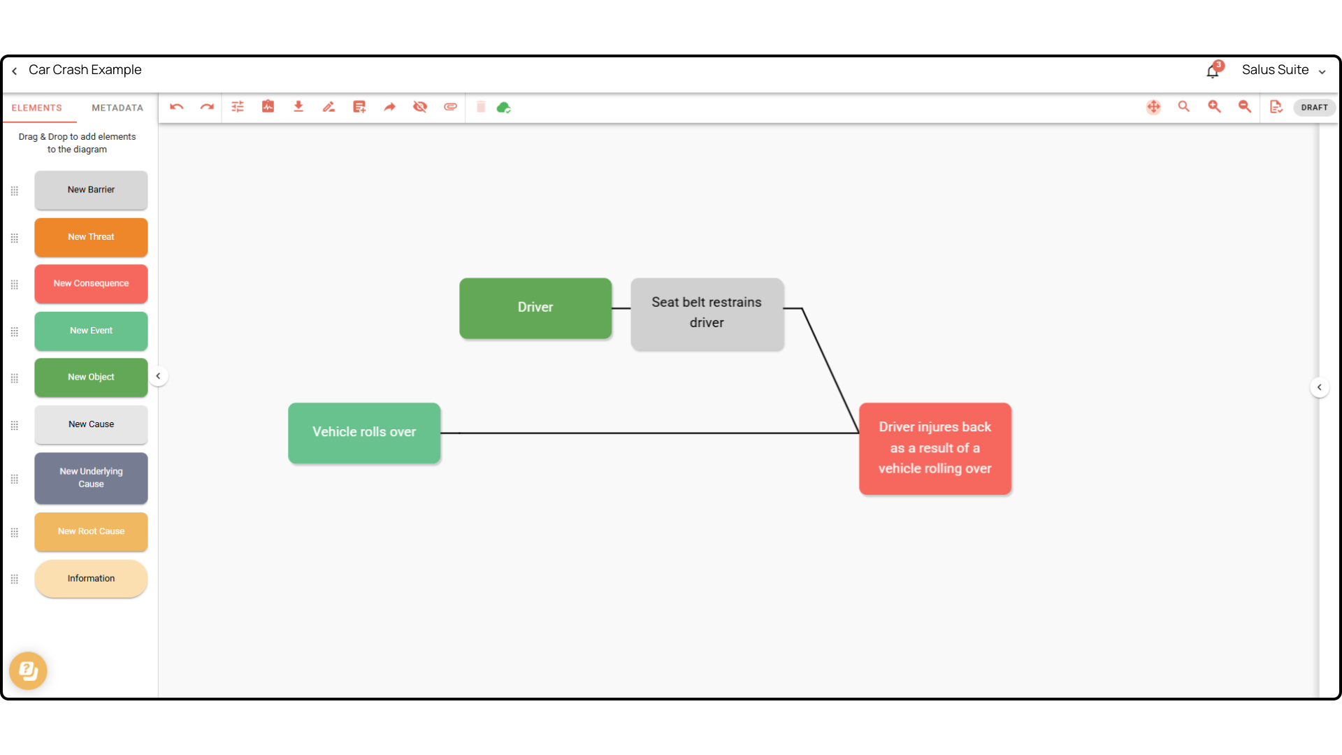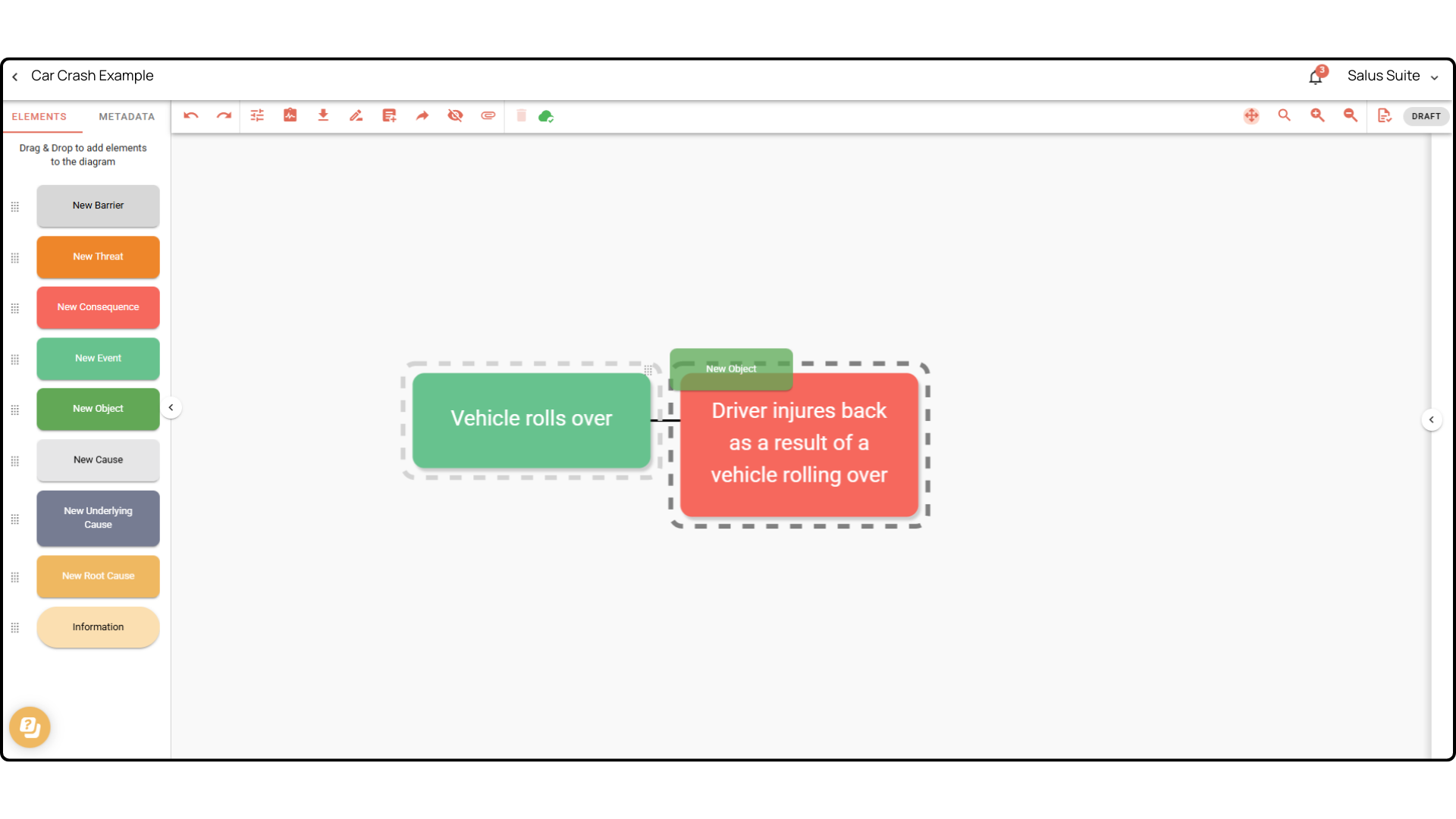 Step 1: Start by dragging an element into the diagram building space. In this simple example, we have plotted out a ‘New Event’ and a ‘New Consequence’. Once you have identified where the ‘New Object’ falls within the timeline, drag and drop within the black dashed lines. ‘New Object’ can only be applied to ‘New Threat’, ‘New Consequence’ and ‘New Event’.