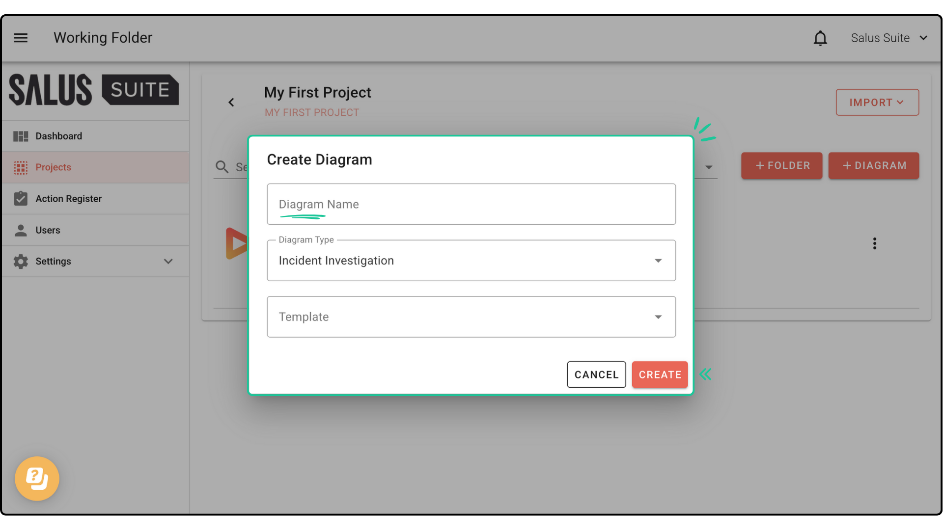 Step 2: In the newly created project, click + Diagram. Enter a diagram name, select Incident Investigation in the Diagram Type, and choose a template, if there is one. Click Create.