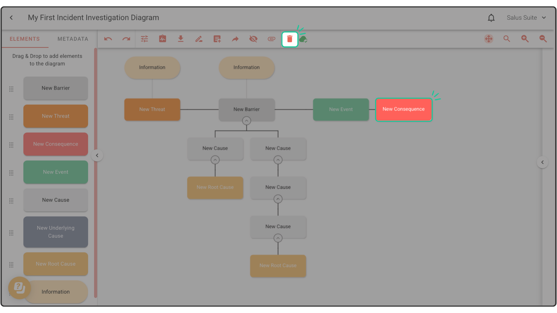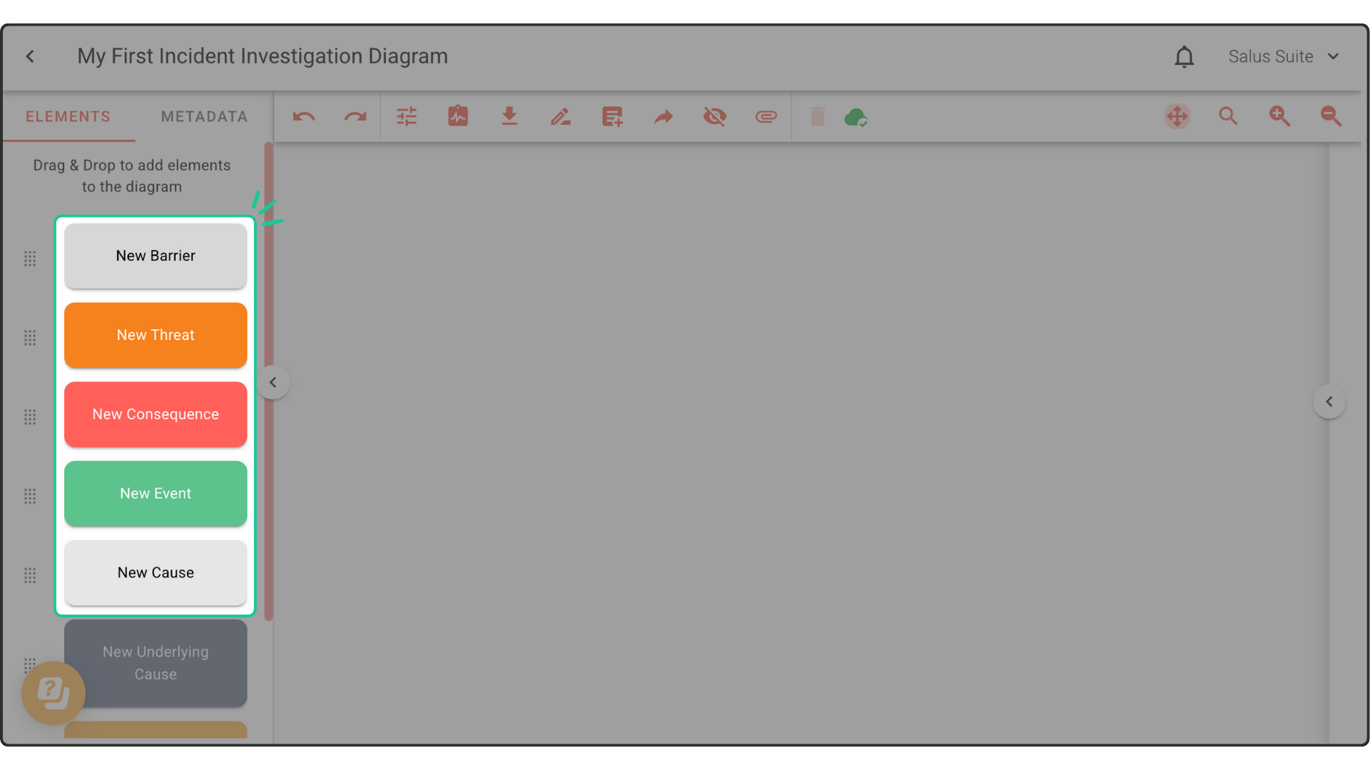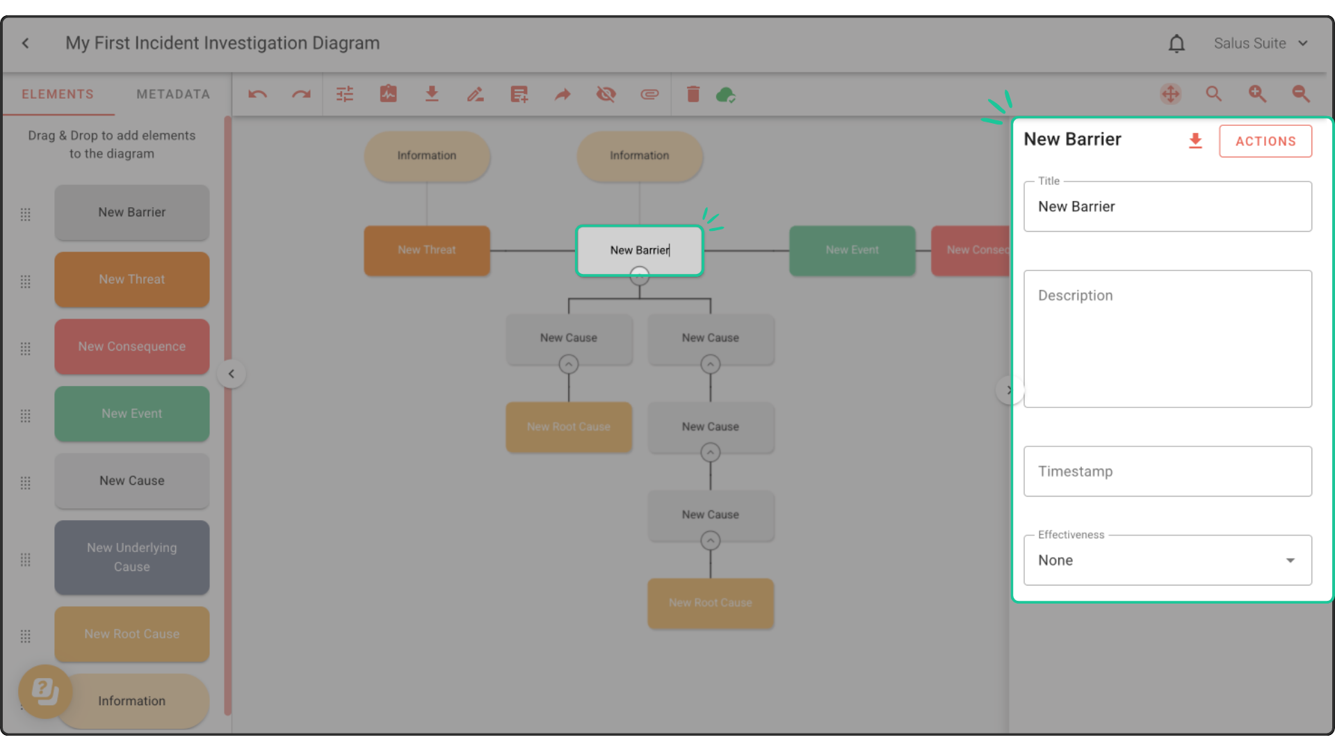 Step 3: Drag and drop elements from the left-hand side of the Diagram Editor into the diagram. Start by placing an Event, Barriers, or Consequence. Then, add a cause, underlying cause, and then root cause underneath the first elements.