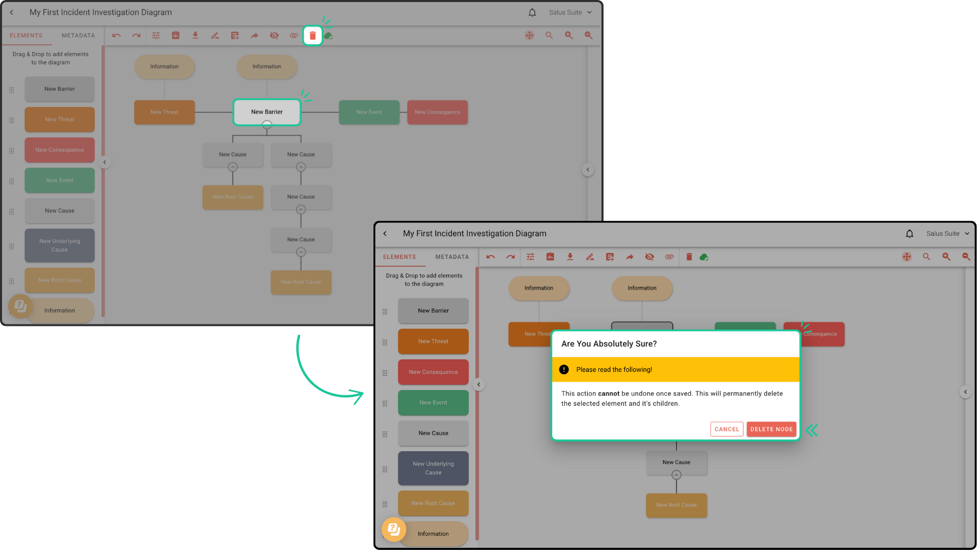 To delete an entire node, double-click on the Threat or Consequence element of the node you wish to delete, and then click on the Delete Element button found on the toolbar. This action cannot be undone once saved. This will permanently delete the selected element and its children.Â