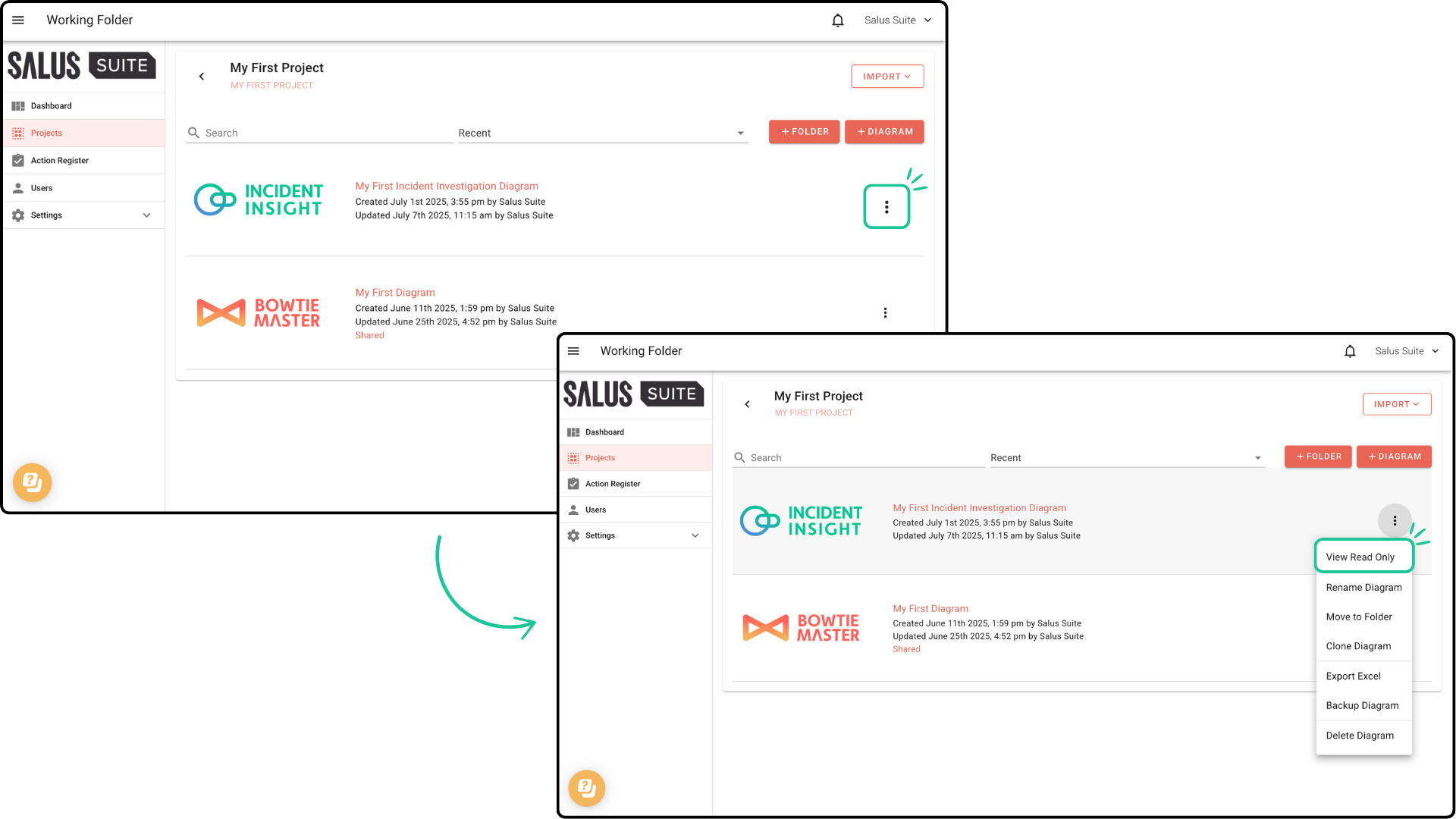 Option 1: In your projects folder, click on the ellipse on a diagram and click View Read Only.