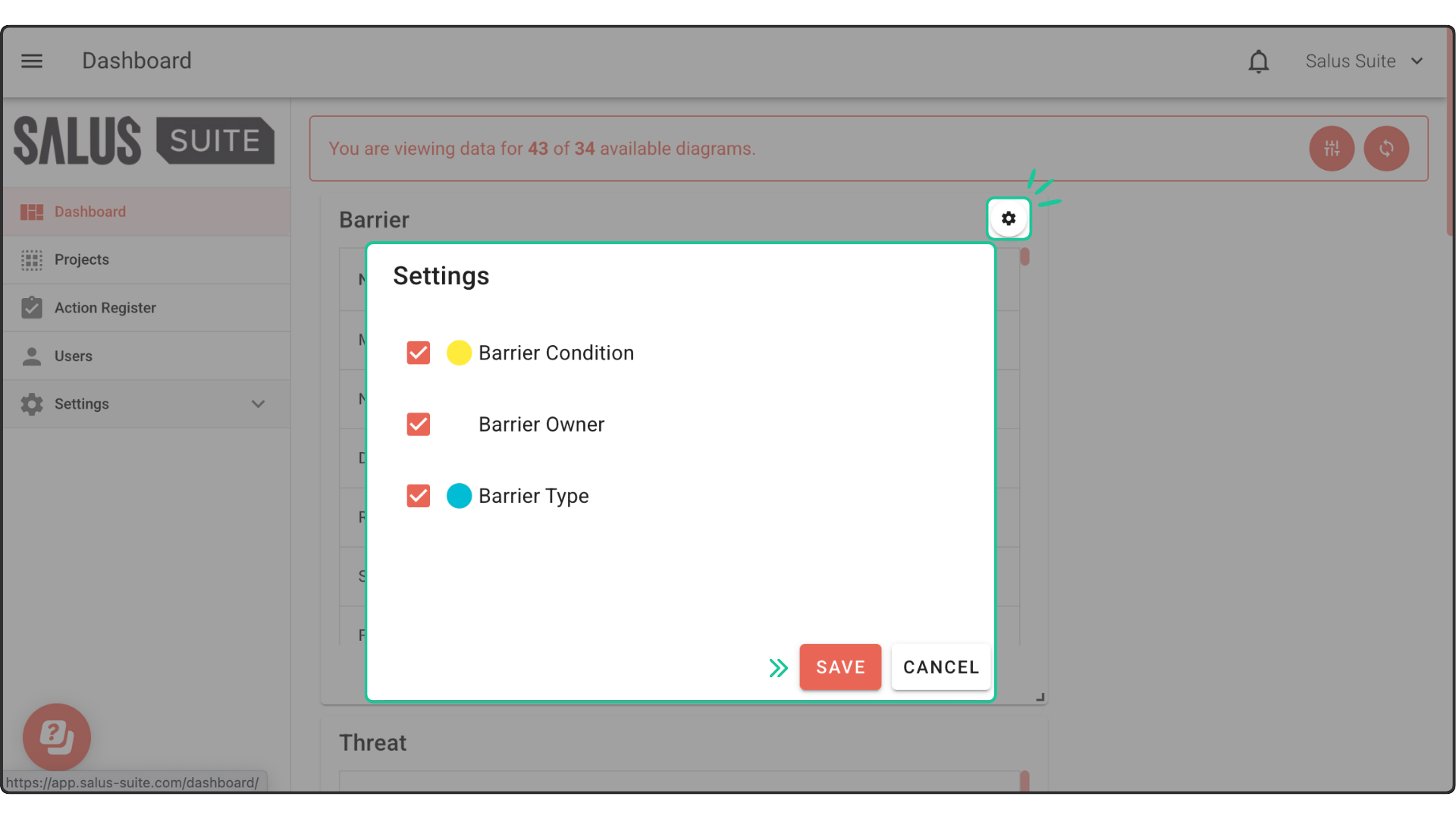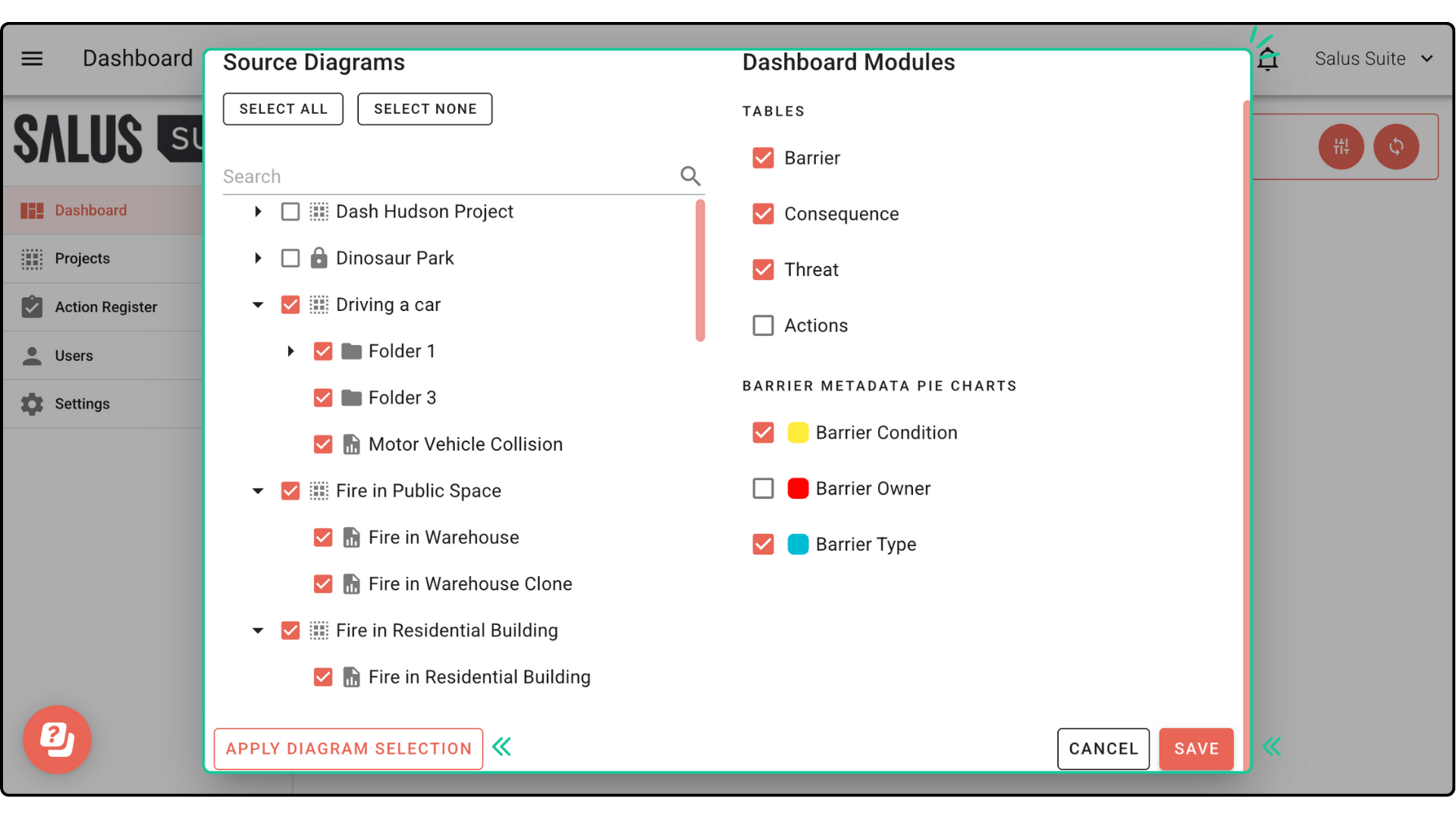 Step 3: In the pop-up, select whole projects or individual diagrams to analyse. Click Apply Diagram Selection. Choose which elements you’d like to display in table format. You can also select which types of metadata you would like to see displayed in pie charts. Press Save.