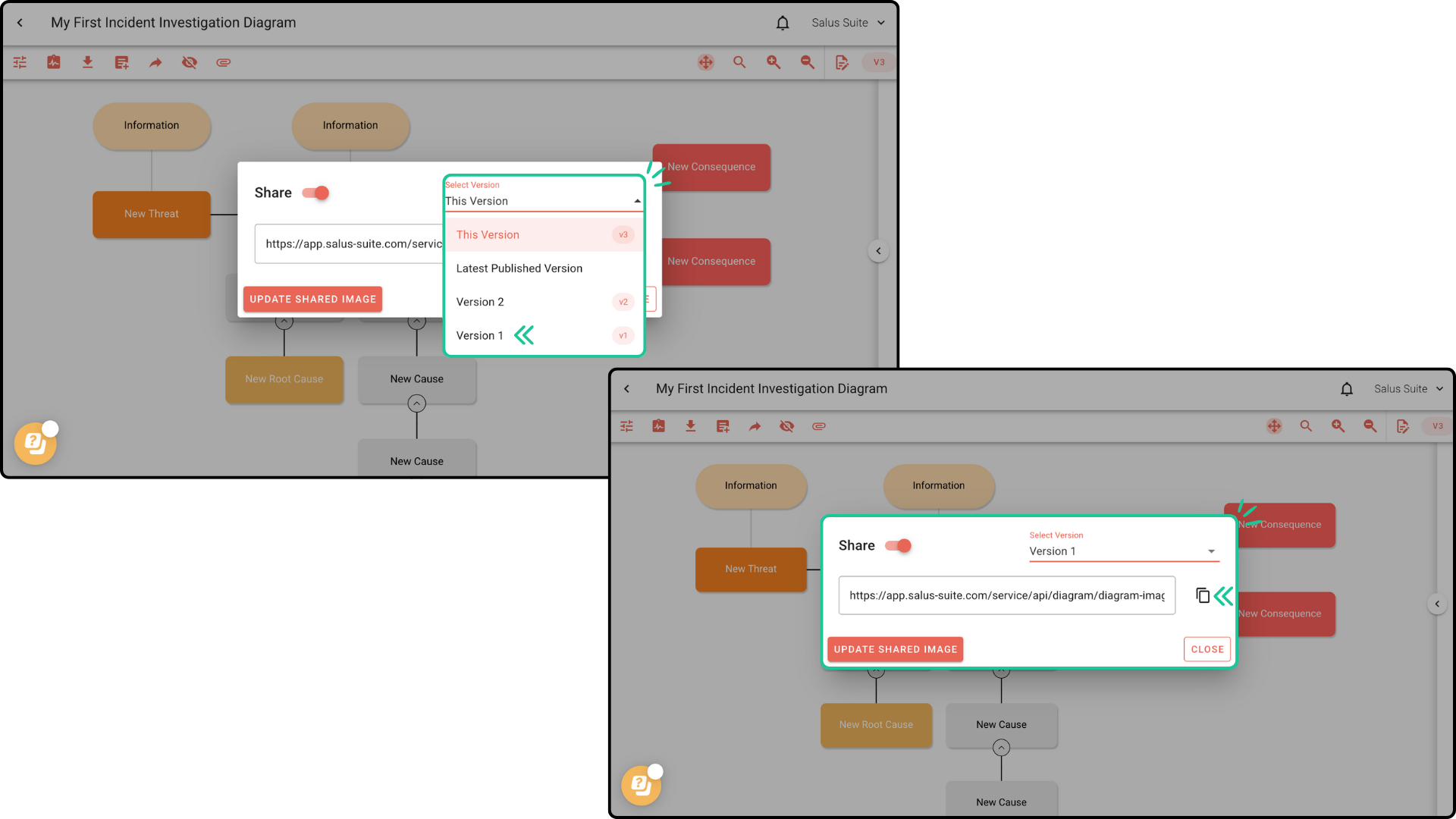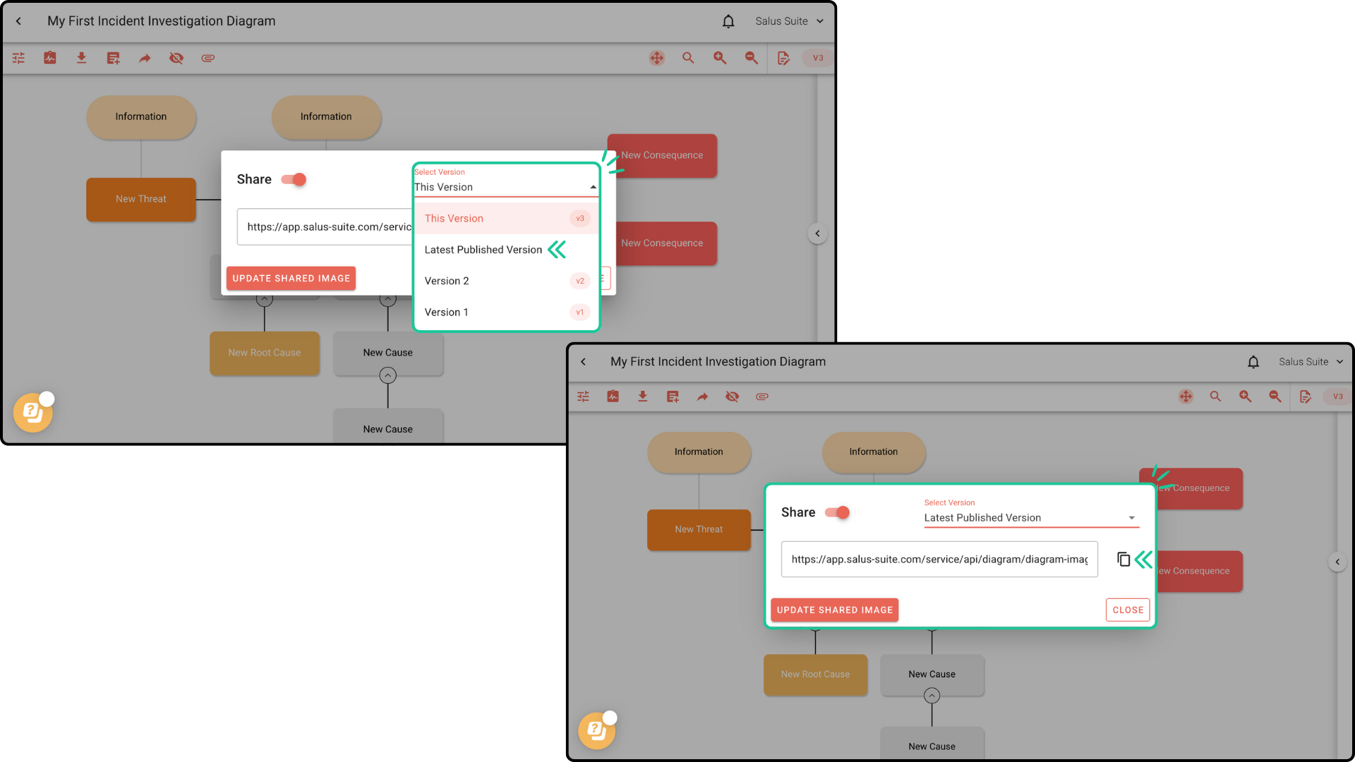 If your diagram has multiple versions, you can choose to share either 1) the current version you are in 2) the latest published version or 3) a different version.
