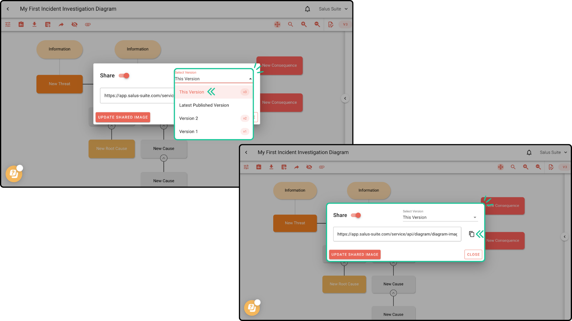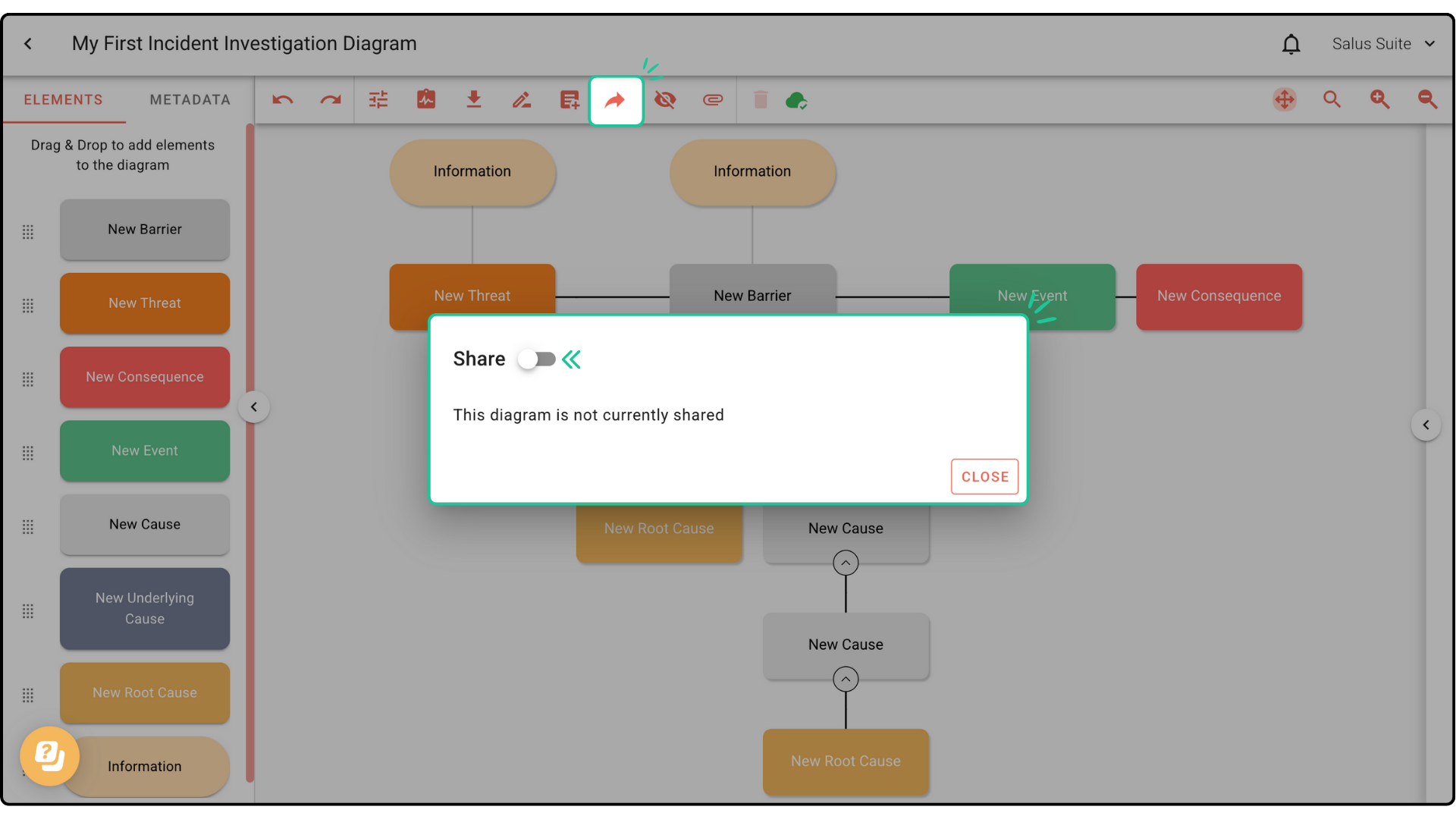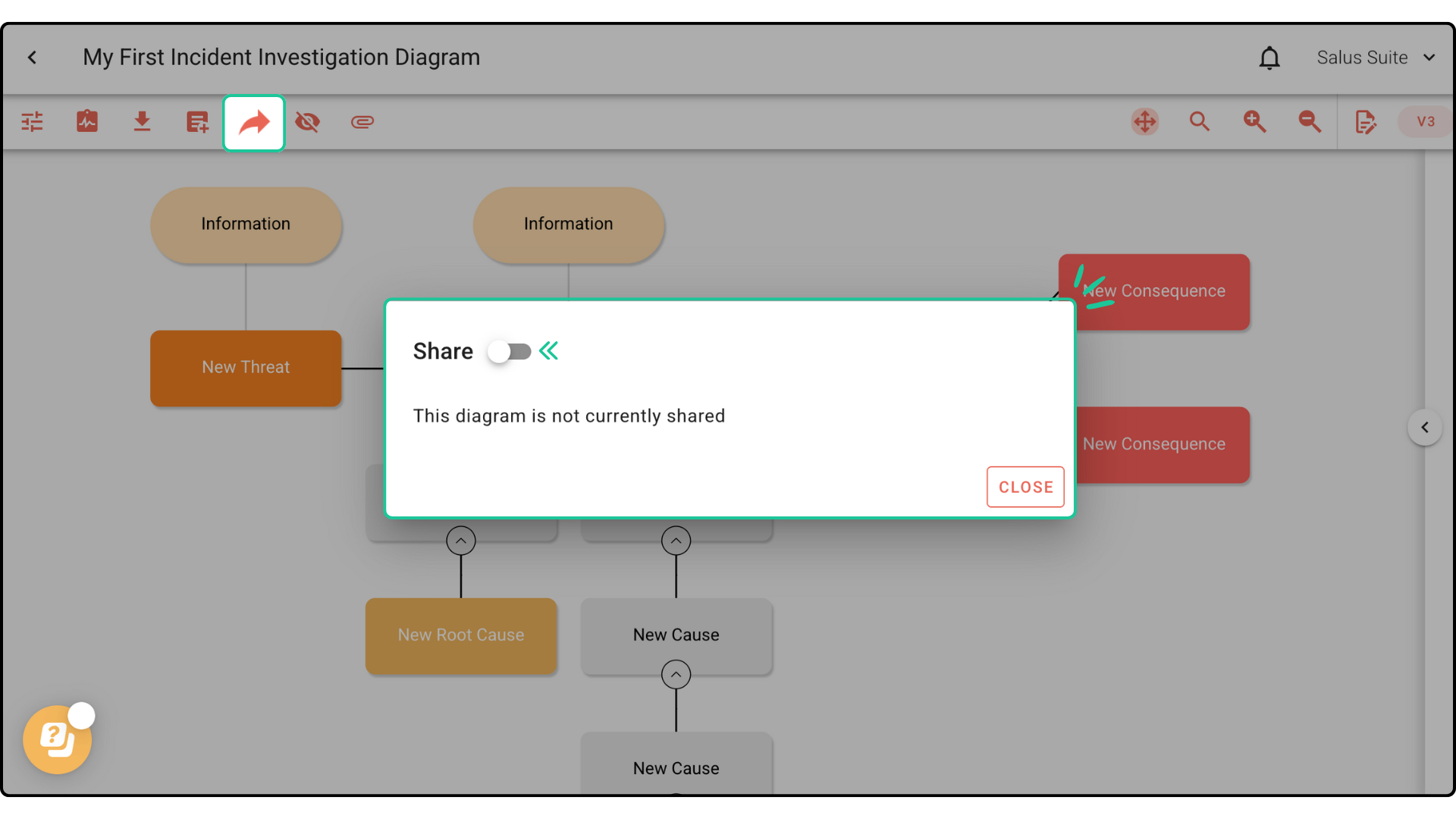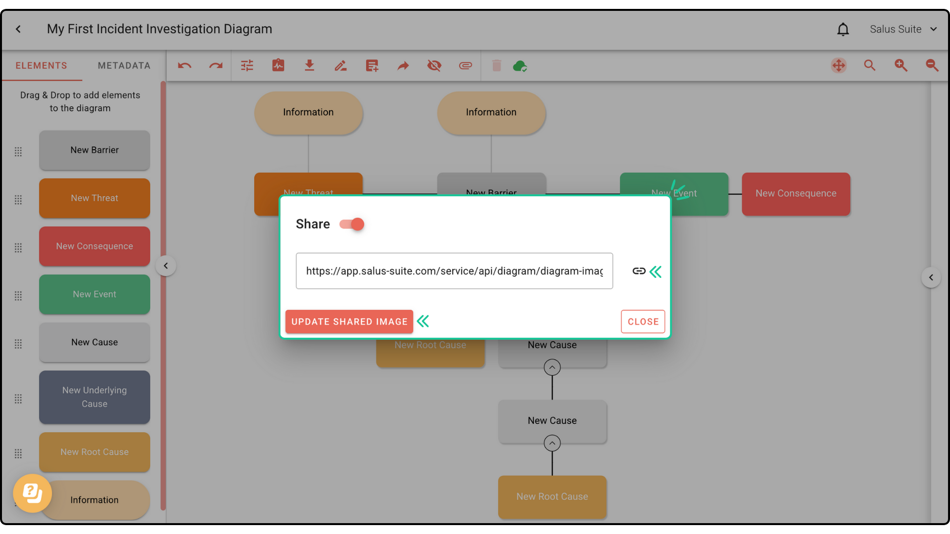 Incident Insight diagrams are wonderful means of making root cause analysis more understandable. It is therefore essential that the diagrams you create can be easily shared across your organisation. A newly created diagram can be shared in three ways:Â