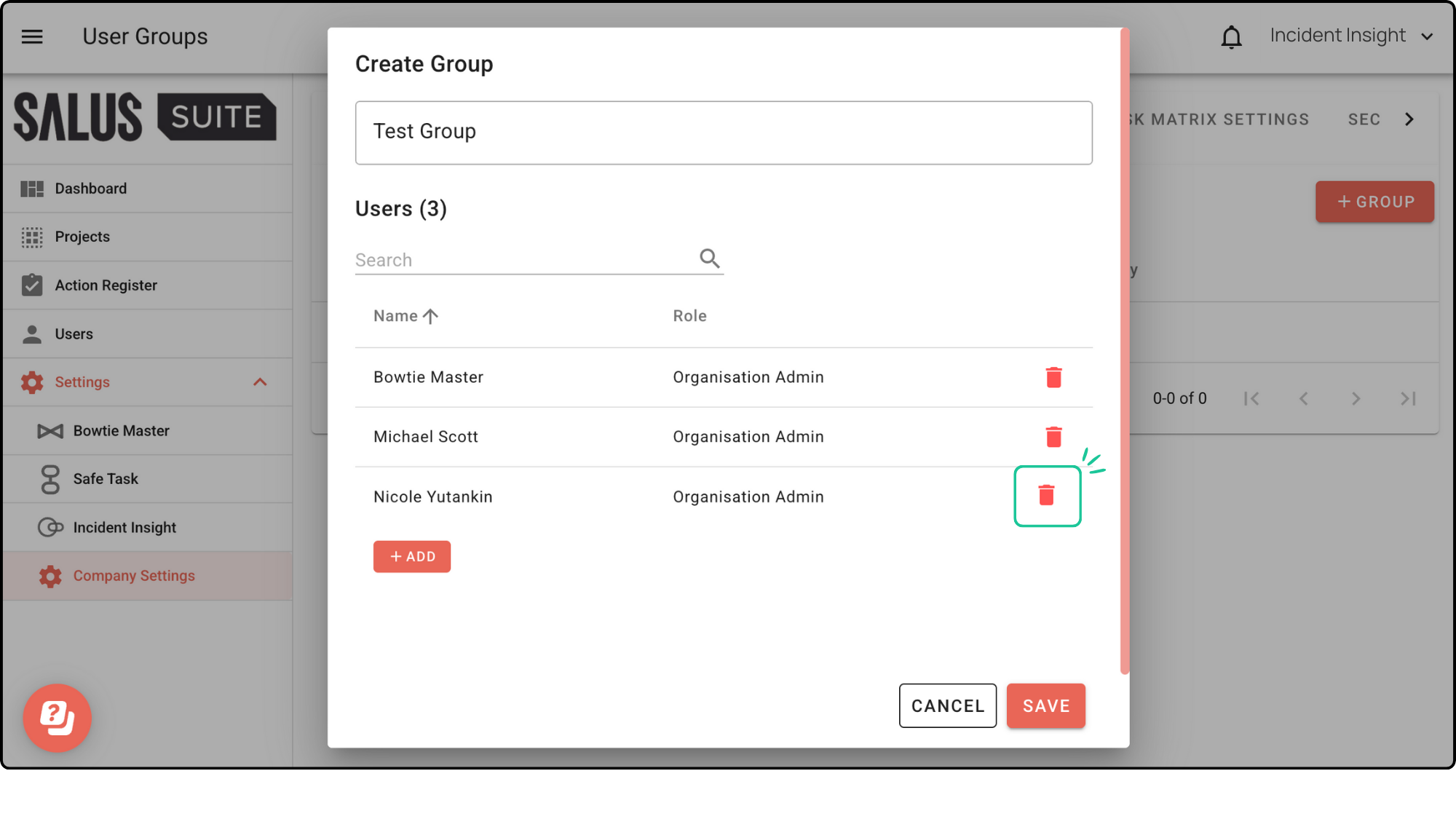 Step 2: Click the Bin icon beside the User to remove a user. The user will automatically be removed from the group.