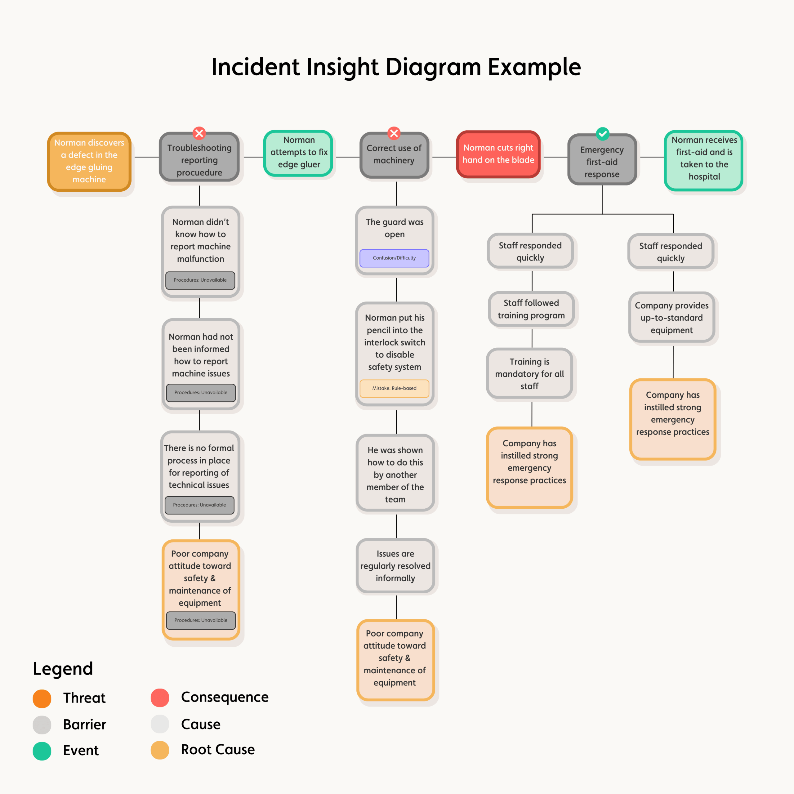 There are six main elements used in an incident insight diagram: threats, events, consequences, barriers, causes, and root causes. Note that different organisations may use different terminology, this can be edited within the main settings of Incident Insight